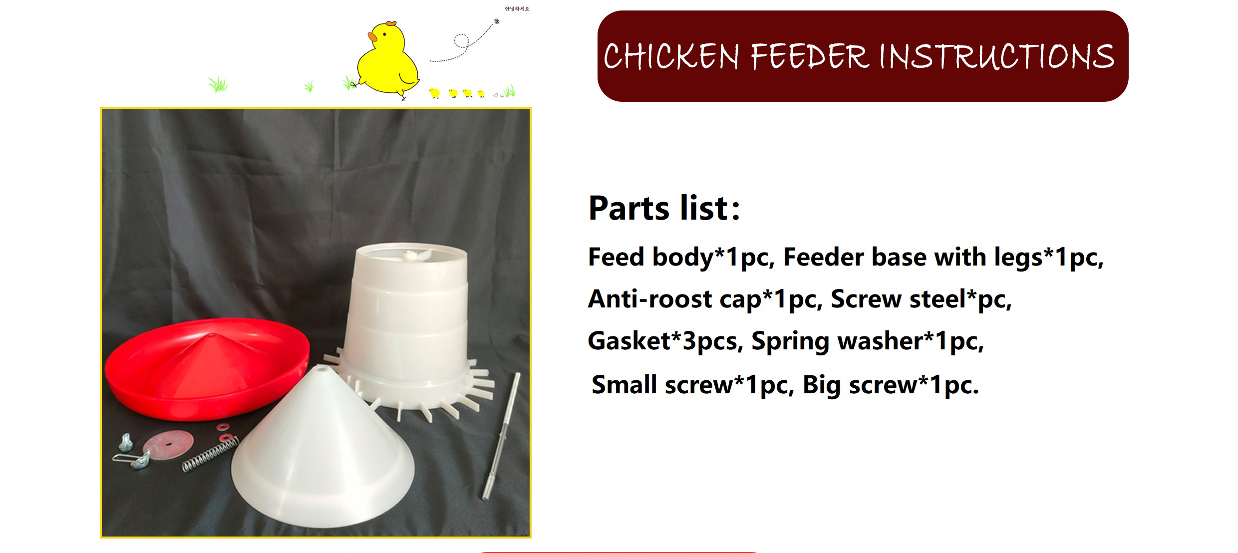 comedero para pollos Cuerpo * 1 pieza, Base del alimentador con patas * 1 pieza, Tapa antipercha * 1 pieza, Tornillo de acero * 1 pieza, Junta * 3 piezas, Arandela de resorte * 1 pieza, Tornillo pequeño * 1 pieza, Tornillo grande * 1 pieza.